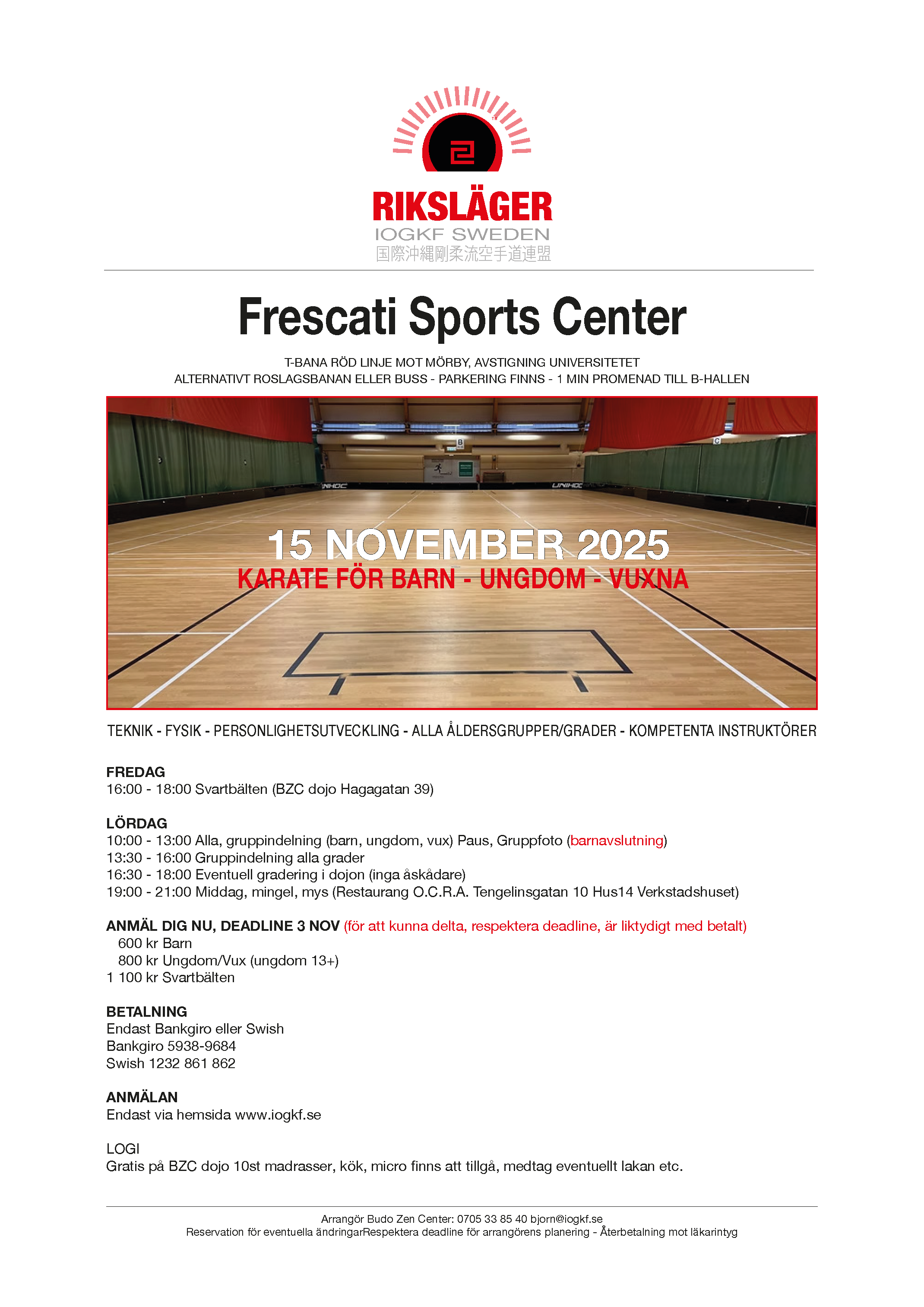 15/11 Riksläger Frescati Hallen ANMÄLL DIG HÄR Förnamn Efternamn E-post Telefon Klubb Klubb - Ingen -Budo Zen CenterÖrnsköldsviks Goju Ryu KararteklubbOkinawa Goyu Ryu SödertörnVarbergs Goju ryu Karate-do DojoAnnat... Enter other… Grad Grad - Ingen -Ograd10 Kyu9 Kyu8 Kyu7 Kyu6 Kyu5 Kyu4 Kyu3 Kyu2 Kyu1 Kyu1 Dan2 Dan3 Dan4 Dan5 Dan6 Dan7 Dan8 Dan9 DanAnnat... Enter other… Mat Mat - Ingen -KöttFiskVegAnnat... Enter other… Anteckningar